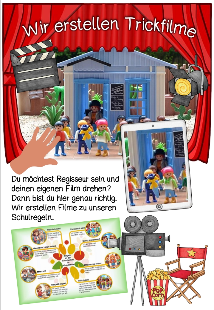 In einer Projektwoche hat sich eine Gruppe von Kindern mit den Schulregeln beschäftigt und diese in einem Stop-Motion-Film dargestellt. Je ein 2-3er Team hat in der Woche zwei Schulregeln mit der App “Stop-Motion” und Playmobilfiguren umgesetzt. Für eine gelungene Verfilmung haben die Kinder vorab Begriffe wie Storyboard, Filmkulisse oder Szene geklärt, sich mit bekannten Stop-Motion-Filmen und ihrer Entstehung beschäftigt (bspw. Shaun das Schaf) und die Funktionen in den Apps Stop-Motion und iMovie kennengelernt. Anschließend durften die Gruppen die Schulregeln in eigenen beispielhaften Geschichten umsetzen. Dabei haben sie die Greenscreen-Funktion verwendet, um die Hintergründe anzupassen.